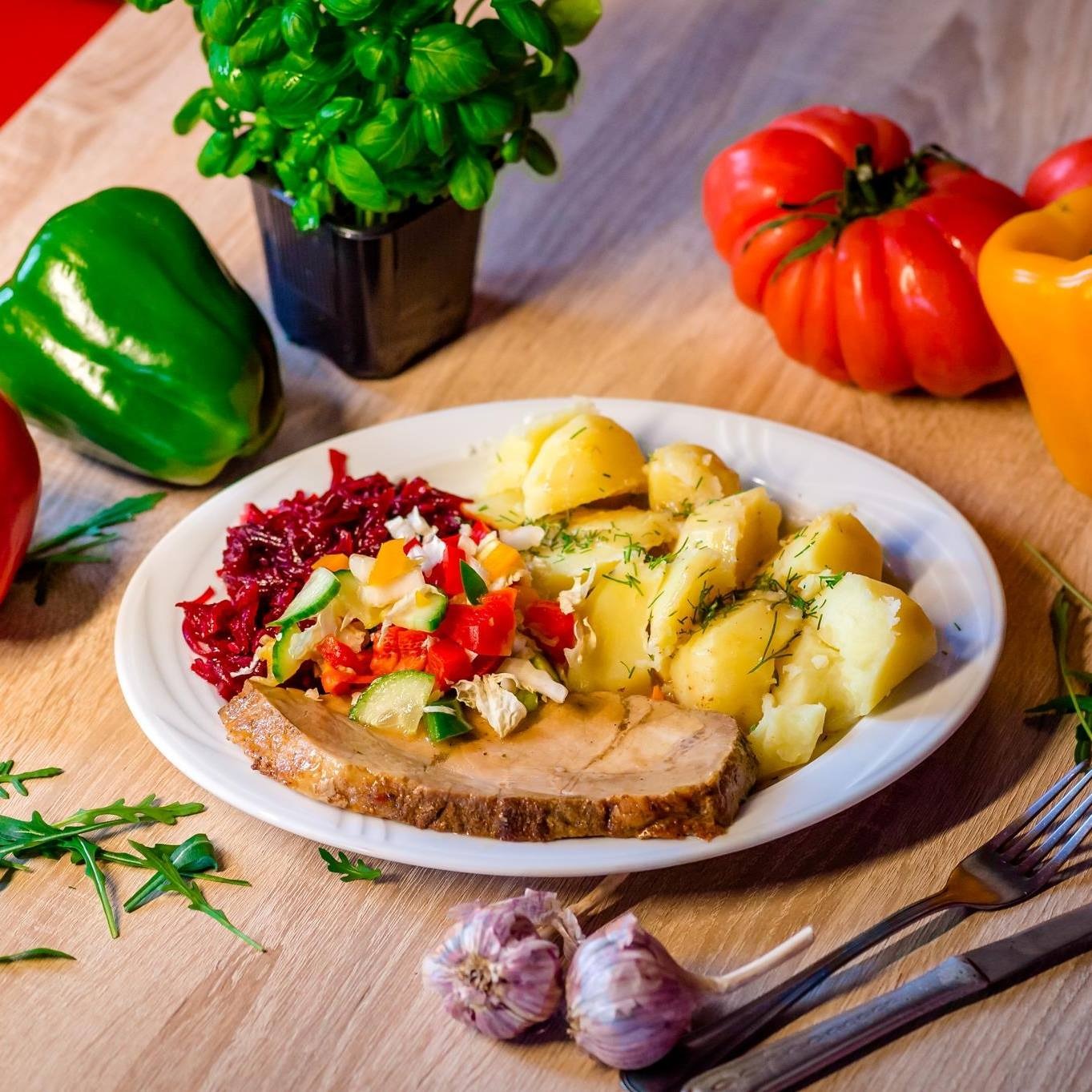 Tradycyjny schabowy zapiekany z pieczarkami i serem. Do wyboru ziemniaki, kluski, frytki lub pieczone kartofelki i surówka. Czas dostawy podany przy zamówieniu jest czasem orientacyjnym, może być krótszy lub dłuższy od podanego. -